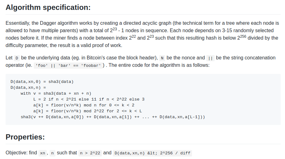 Dagger was named after the "directed acyclic graph" (DAG), the mathematical structure that is used in the algorithm. The idea is that every N blocks, a new DAG would be pseudorandomly generated from a seed, and the bottom layer of the DAG would be a collection of nodes that takes several gigabytes to store. However, generating any individual value in the DAG would require calculating only a few thousand entries. A "Dagger computation" involved getting some number of values in random positions in this bottom-level dataset and hashing them together. This meant that there was a fast way to make a Dagger calculation - already having the data in memory, and a slow, but not memory intensive way - regenerating each value from the DAG that you need to get from scratch.