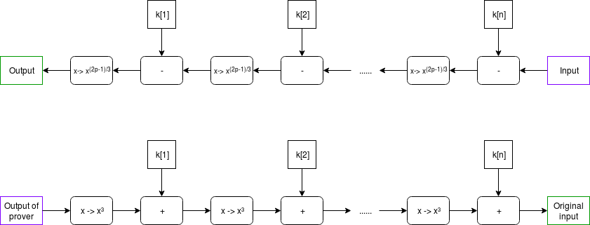 k[64]it loops back to usingk[1]).MIMC with a very large number of rounds, as we're doing here, is useful as a verifiable delay function - a function which is difficult to compute, and particularly non-parallelizable to compute, but relatively easy to verify. MIMC by itself achieves this property to some extent because MIMC can be computed "backward" (recovering the "input" from its corresponding "output"), but computing it backward takes about 100 times longer to compute than the forward direction (and neither direction can be significantly sped up by parallelization). So you can think of computing the function in the backward direction as being the act of "computing" the non-parallelizable proof of work, and computing the function in the forward direction as being the process of "verifying" it.