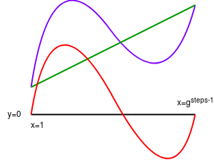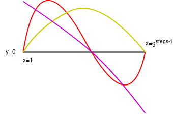 Black: powers of \(g_1\). Purple: powers of \(g_2\). Orange: 1. You can look at successive roots of unity as being arranged in a circle in this way. We are "laying" the computational trace along powers of \(g_1\), and then extending it compute the values of the same polynomial at the intermediate values (ie. the powers of \(g_2\)).