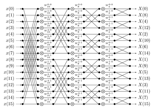 [x[0] .... x[n-1]], and its goal is to outputx[0] + x[1] + ... + x[n-1]as the first element,x[0] + x[1] * 2 + ... + x[n-1] * w**(n-1)as the second element, etc etc; a fast Fourier transform accomplishes this by splitting the data in half, doing an FFT on both halves, and then gluing the result back together.A diagram of how information flows through the FFT computation. Notice how the FFT consists of a "gluing" step followed by two copies of the FFT on two halves of the data, and so on recursively until you're down to one element.