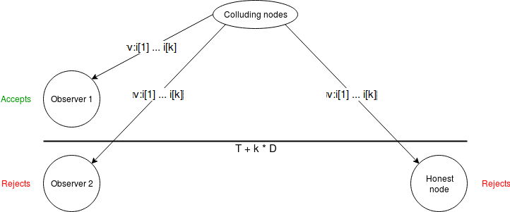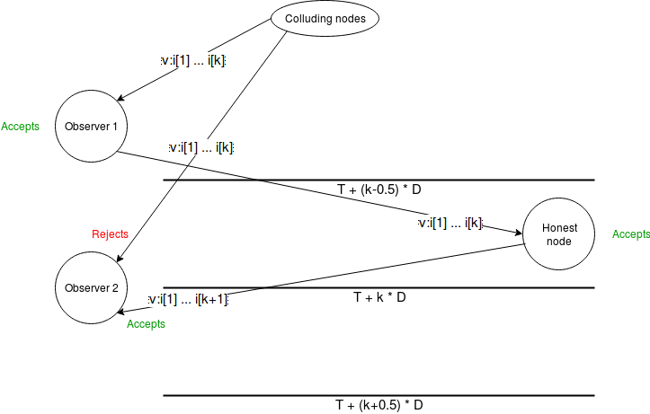 But we can plug this hole. We require \(D\) to be a bound on two times network latency plus clock disparity. We then put a different timeout on observers: an observer accepts \(v : i[1] : .... : i[k]\) before time \(T + (k - 0.5) \cdot D\). Now, suppose an observer sees a message an accepts it. They will be able to broadcast it to an honest node before time \(T + k \cdot D\), and the honest node will issue the message with their signature attached, which will reach all other observers before time \(T + (k + 0.5) \cdot D\), the timeout for messages with \(k+1\) signatures.