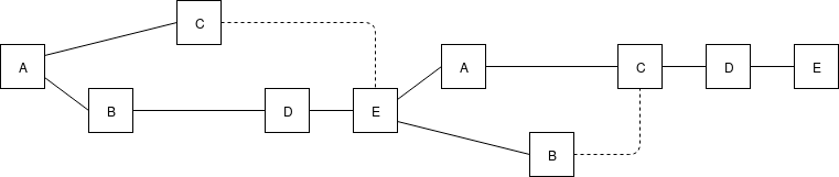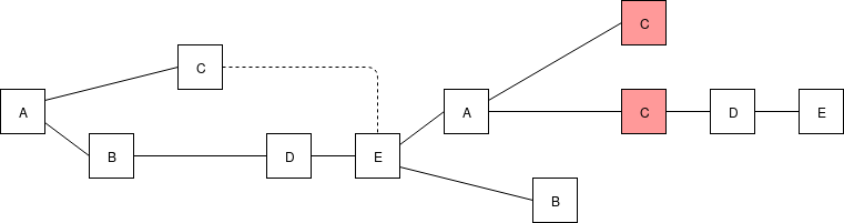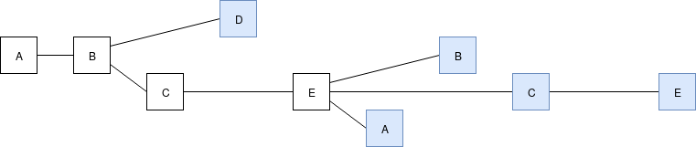 Note that all four of the validators could have seen one or both of \(B\)'s blocks, and \(D\) and \(E\) could have seen \(C\)'s second block, making that the latest message in their views instead of \(C\)'s first block; however, the structure of the chain itself gives us no evidence that they actually did. Fortunately, as we will see below, this ambiguity does not matter for us.