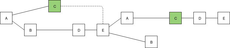 Dotted lines are uncle links, eg. when E creates a block, E