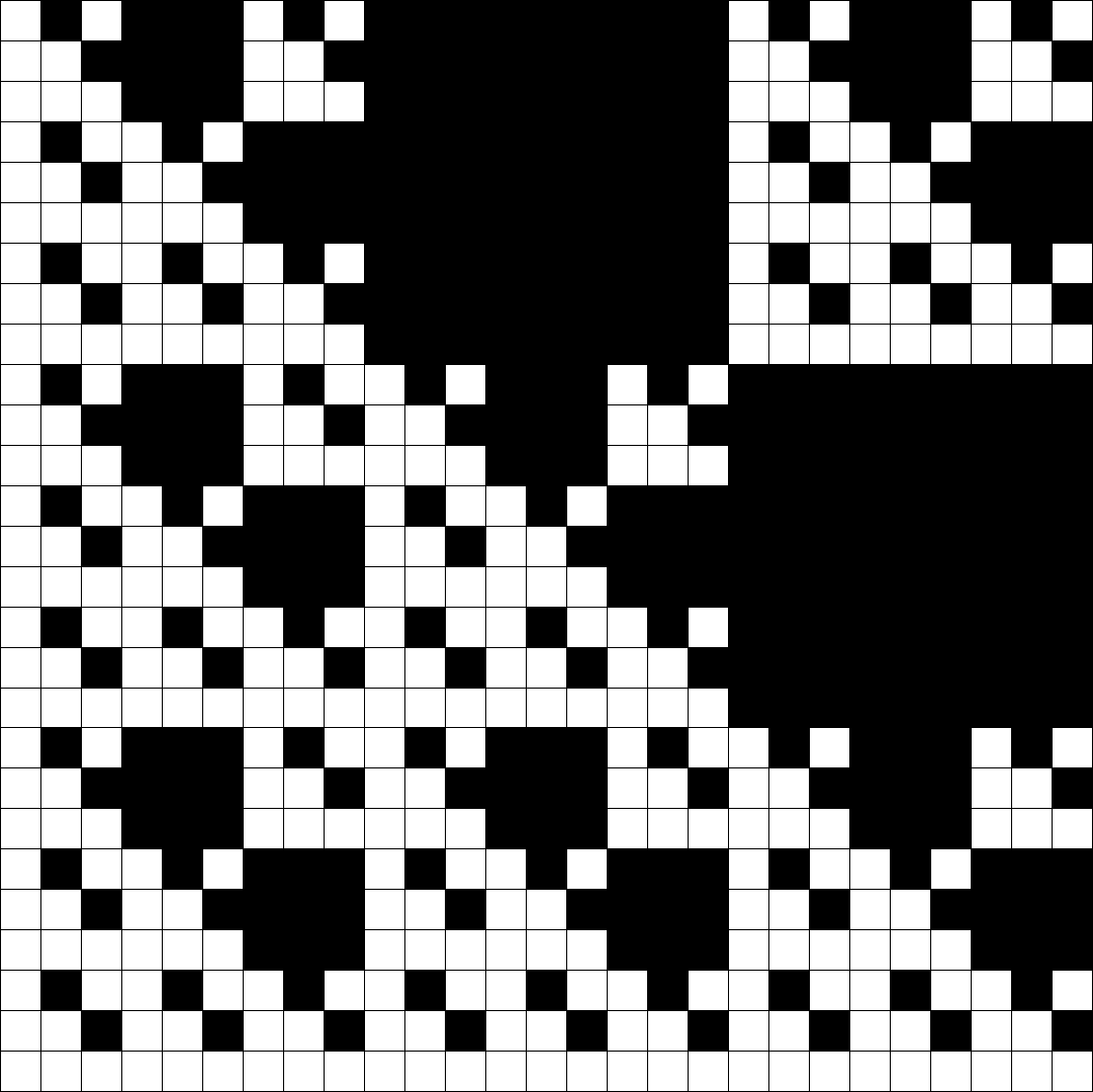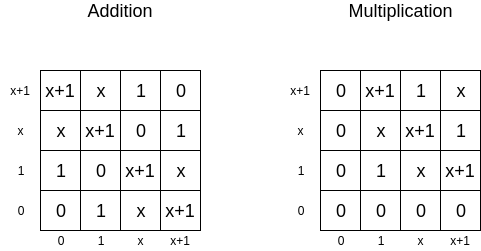 Here, we have the same concept as above, except we use an even spookier mathematical structure, the 4-element field of polynomials over \(Z_2\) modulo \(x^2 + x + 1\). This structure has pretty much no reasonable geometric interpretation, so I'll just give you the addition and multiplication tables: