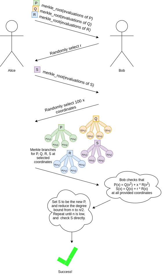 Notice that \(Q\) and \(R\) both have degree \(< \frac{n}{2}\). Because \(S\) is a linear combination of \(Q\) and \(R\), \(S\) also has degree \(< \frac{n}{2}\). And this works in reverse: if we can prove \(S\) has degree \(< \frac{n}{2}\), then the fact that it's a randomly chosen combination prevents the prover from choosing malicious \(Q\) and \(R\) with hidden high-degree coefficients that "cancel out", so \(Q\) and \(R\) must both be degree \(< \frac{n}{2}\), and because \(P(x) = Q(x^2) + x * R(x^2)\), we know that \(P\) must have degree \(< n\).
