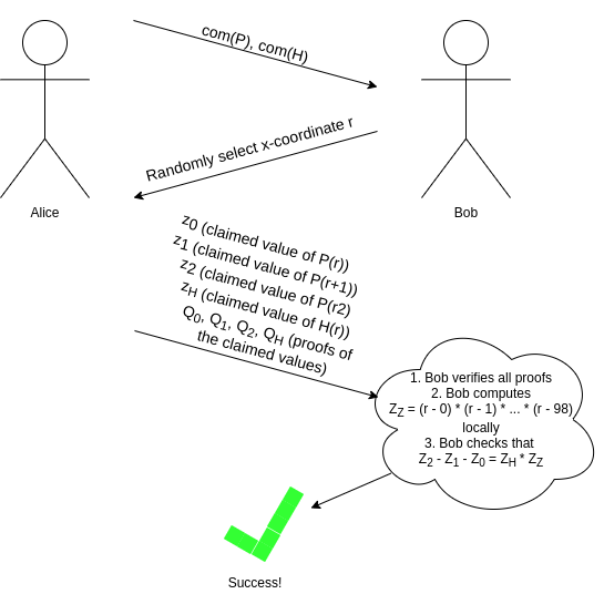 And if you can evaluate, you can do all kinds of checks. This is because there is a mathematical theorem that says, approximately, that if some equation involving some polynomials holds true at a randomly selected coordinate, then it almost certainly holds true for the polynomials as a whole. So if all we have is a mechanism to prove evaluations, we can check eg. our equation \(P(x + 2) - P(x + 1) - P(x) = Z(x) * H(x)\) using an interactive game: