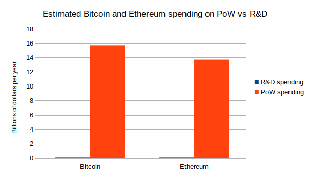 The Bitcoin and Ethereum blockchain ecosystems both spend far more on network security - the goal of proof of work mining - than they do on everything else combined. The Bitcoin blockchain has paid an average of about $38 million per day in block rewards to miners since the start of the year, plus about $5m/day in transaction fees. The Ethereum blockchain comes in second, at $19.5m/day in block rewards plus $18m/day in tx fees. Meanwhile, the Ethereum Foundation's annual budget, paying for research, protocol development, grants and all sorts of other expenses, is a mere $30 million per year. Non-EF-sourced funding exists too, but it is at most only a few times larger. Bitcoin ecosystem expenditures on R&D are likely even lower. Bitcoin ecosystem R&D is largely funded by companies (with $250m total raised so far according to this page), and this report suggests about 57 employees; assuming fairly high salaries and many paid developers not being counted, that works out to about $20m per year.