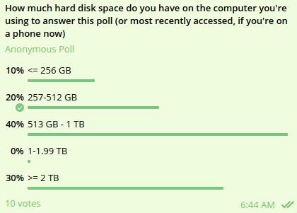 A poll in a group of blockchain protocol researchers of how much disk space everyone has. Small sample size, I know, but still...