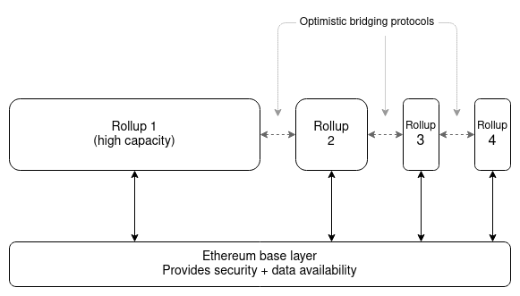 What does this mean for Ethereum? First of all, Ethereum is very well-positioned to adjust to this future world, despite the inherent uncertainty. The profound benefit of the Ethereum rollup-centric roadmap is that it means that Ethereum is open to all of the futures, and does not have to commit to an opinion about which one will necessarily win. Will users very strongly want to be on a single rollup? Ethereum, following its existing course, can be the base layer of that, automatically providing the anti-fraud and anti-censorship "armor" that high-capacity domains need to be secure. Is making a high-capacity domain too technically complicated, or do users just have a great need for variety? Ethereum can be the base layer of that too - and a very good one, as the common root of trust makes it far easier to move assets between rollups safely and cheaply.