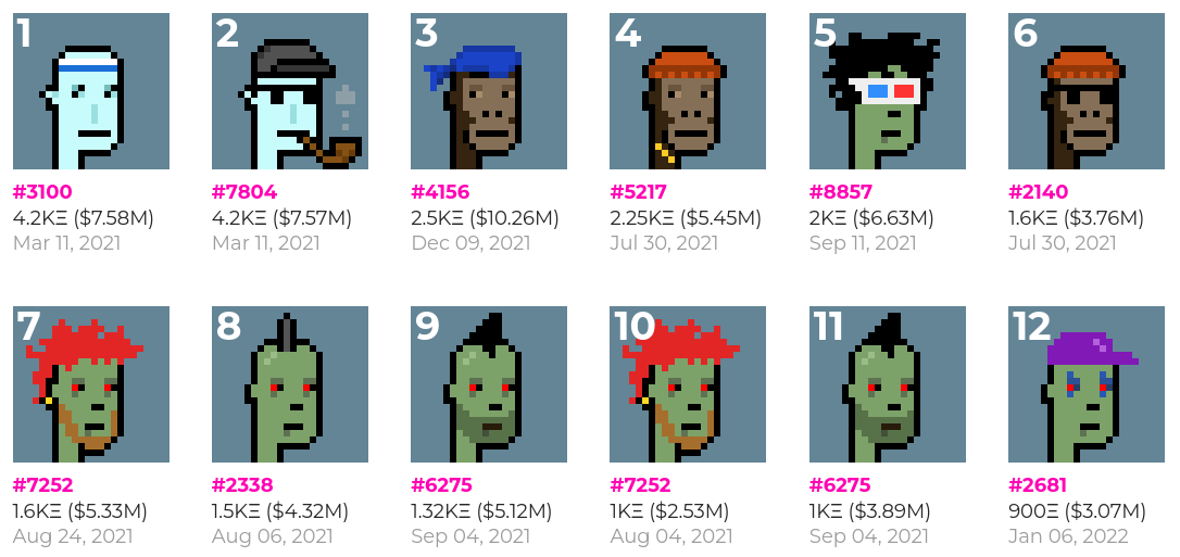 CryptoPunks are now regularly being sold for many millions of dollars, and they are not even the most expensive NFTs out there. Image source here.