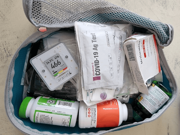 This contains a combination of various life-extension medicines (metformin, ashwagandha, and some vitamins), and covid defense gear: a CO2 meter (CO2 concentration minus 420 roughly gives you how much human-breathed-out air you're breathing in, so it's a good proxy for virus risk), masks, antigen tests and fluvoxamine. The tests were a free care package from the Singapore government, and they happened to be excellent on cm3 so I carry them around. Covid defense and life extension are both fields where the science is rapidly evolving, so don't blindly follow this static list; follow the science yourself or listen to the latest advice of an expert that you do trust. Air filters and far-UVC (especially 222 nm) lamps are also promising covid defense options, and portable versions exist for both.