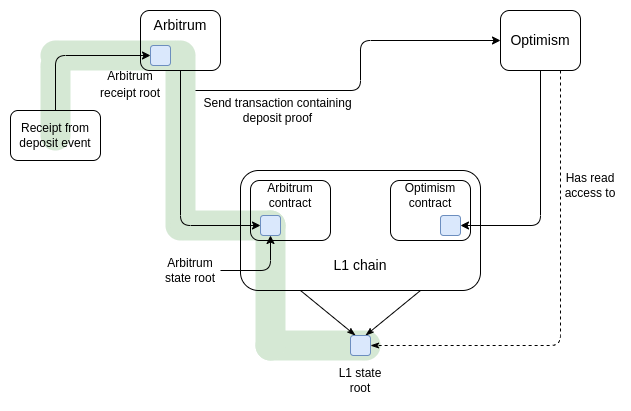 Even though the Merkle path needed to prove the deposit on Arbitrum goes through the L1 state, Optimism only needs to read the L1 state root to process the deposit - no L1 transactions required. Note that because data on rollups is the scarcest resource, a practical implementation of such a scheme would use a SNARK or a KZG proof, rather than a Merkle proof directly, to save space.