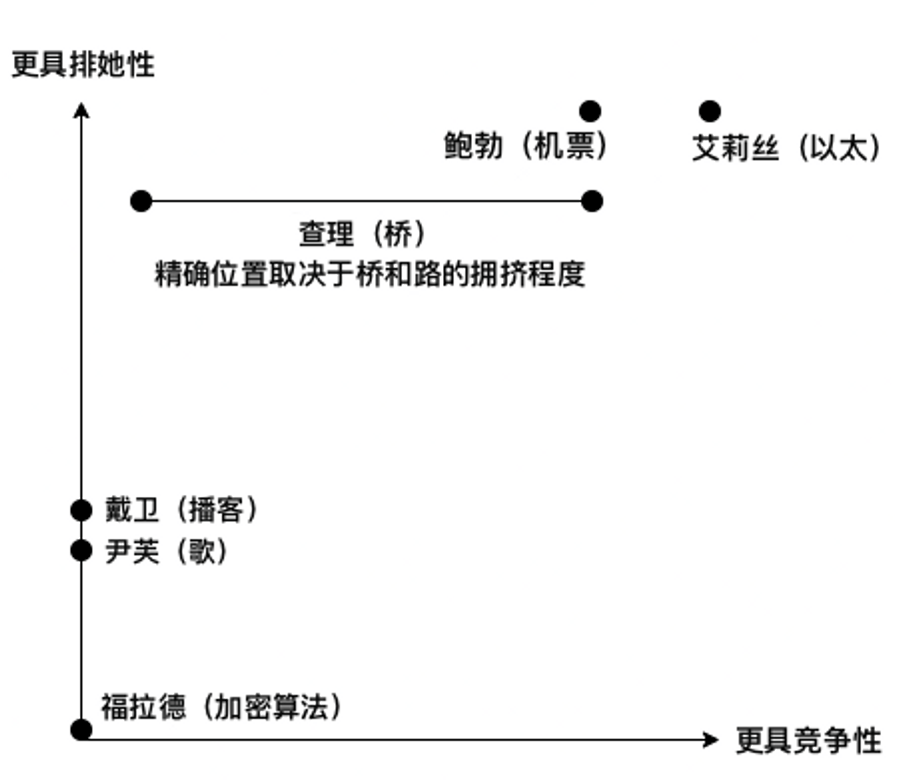 - 艾莉丝持有的以太是完全排他的(她对"谁可以得到她的以太有完全的掌控和选择权),而加密货币是竞争性的(如果一个人拥有一个特定的硬币,其他人就不会拥有同样的硬币)。