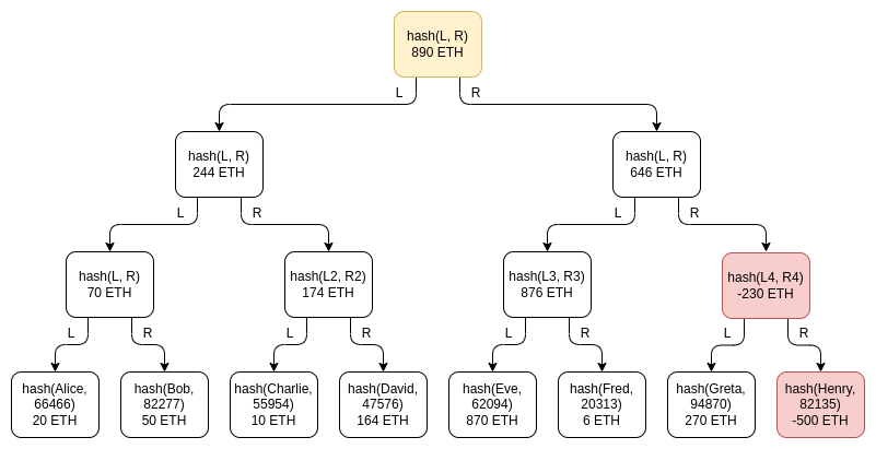 One important subtlety of the scheme is the possibility of negative balances: what if an exchange that has 1390 ETH of customer balances but only 890 ETH in reserves tries to make up the difference by adding a -500 ETH balance under a fake account somewhere in the tree? It turns out that this possibility does not break the scheme, though this is the reason why we specifically need a Merkle sum tree and not a regular Merkle tree. Suppose that Henry is the fake account controlled by the exchange, and the exchange puts -500 ETH there: