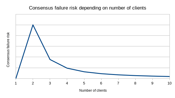 There is a tradeoff in using the multi-client approach to minimize the risk of catastrophic bugs: instead, you get consensus failure bugs. That is, if you have two clients, there is a risk that the clients have subtly different interpretations of some protocol rule, and while both interpretations are reasonable and do not allow stealing money, the disagreement would cause the chain to split in half. A serious split of that type happened once in Ethereum's history (there have been other much smaller splits where very small portions of the network running old versions of the code forked off). Defenders of the single-client approach point to consensus failures as a reason to not have multiple implementations: if there is only one client, that one client will not disagree with itself. Their model of how number of clients translates into risk might look something like this: