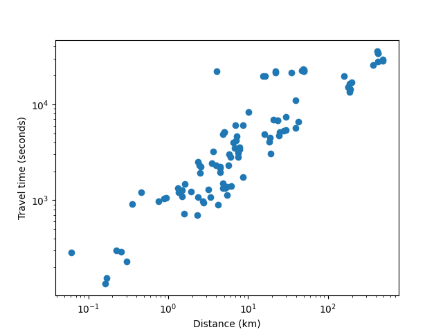 (distance, time)pairs, drawing a scatter plot, with time and distance as axes, both axes logarithmically scaled (it gave the correct answer on the first try)This gave me some really nice data (this is filtered for distances under 500km, as above 500km the best path almost certainly includes flying, and the Google Maps directions don't take into account flights):