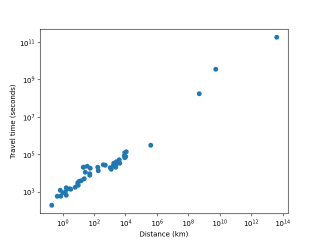 So there we go, there seems to be some kind of really weird fractal law of travel time. Of course, different transit technologies could change this relationship: if you replace public transit with cars and commercial flights with private jets, travel time becomes somewhat more linear. And once we upload our minds onto computer hardware, we'll be able to travel to Alpha Centauri on much crazier vehicles like ultralight craft propelled by Earth-based lightsails) that could let us go anywhere at a significant fraction of the speed of light. But for now, it does seem like there is a strangely consistent relationship that puts time much closer to the square root of distance.