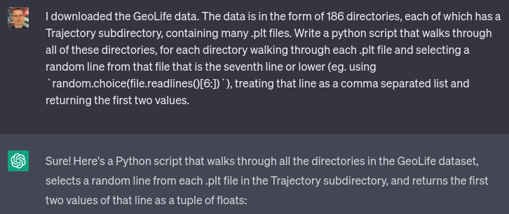 I went with the GeoLife dataset. I did notice that while it claims to be about users around the world, primarily it seems to focus on people in Seattle and Beijing, though they do occasionally visit other cities. That said, I'm not a perfectionist and I was fine with it. I asked ChatGPT to write me a script to interpret the dataset and extract a randomly selected coordinate from each file: