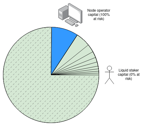Each version of staked ETH needs to have some mechanism determining who can be the underlying node operators. It can't be unrestricted, because then attackers would join and amplify their attacks with users' funds. Currently, the top two are Lido, which has a DAO whitelisting node operators, and Rocket Pool, which allows anyone to run a node if they put down 8 ETH (ie. 1/4 of the capital) as a deposit. These two approaches have different risks: the Rocket Pool approach allows attackers to 51% attack the network, and force users to pay most of the costs. With the DAO approach, if a single such staking token dominates, that leads to a single, potentially attackable governance gadget controlling a very large portion of all Ethereum validators. To the credit of protocols like Lido, they have implemented safeguards against this, but one layer of defense may not be enough.