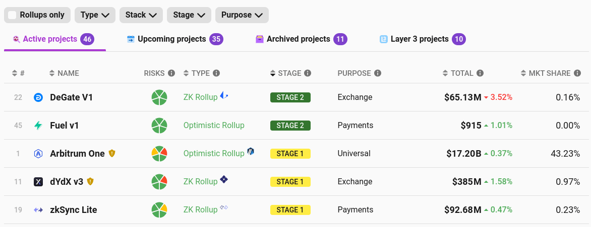 We are still far from a world where rollups are truly protected by code. In fact, according to l2beat only these five, of which only Arbitrum is full-EVM, have even reached what I have called "stage 1".