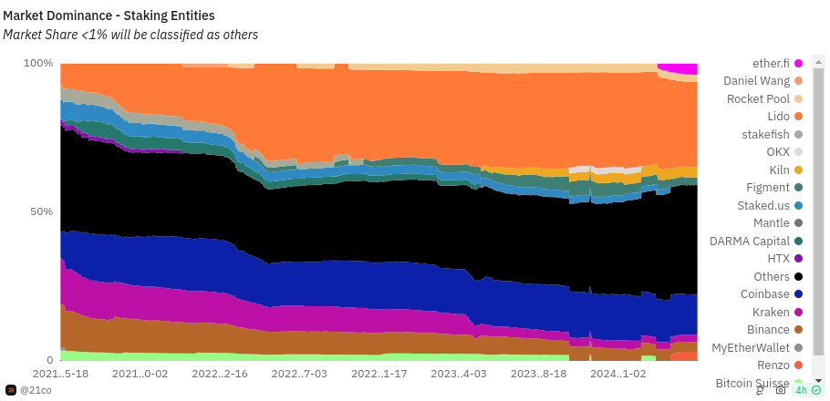 Today, solo stakers make up a relatively small percentage of all Ethereum staking, and most staking is done by various providers - some centralized operators, and others DAOs, like Lido and RocketPool.