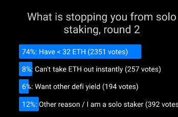 I have done my own research - various polls [1] [2], surveys, in-person conversations, asking the question "why are you - specifically you - not solo staking today?" To me, a robust solo staking ecosystem is by far my preferred outcome for Ethereum staking, and one of the best things about Ethereum is that we actually try to support a robust solo staking ecosystem instead of just surrendering to delegation. However, we are far from that outcome. In my polls and surveys, there are a few consistent trends: