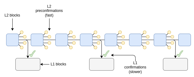 The "they're the same picture" meme is getting quite overused at this point, so I'll just put an old diagram I drew years ago to describe Gasper's slot-and-epoch architecture and a diagram of L2 preconfirmations beside each other, and hopefully that will get the point across.