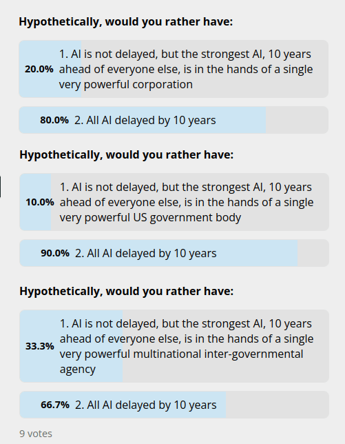 One way in which a divergence might happen, is if the goals of decentralization and acceleration diverge. Last year, I made a series of polls essentially asking people which of those two they value more in the context of AI. The results decidedly favored the former: