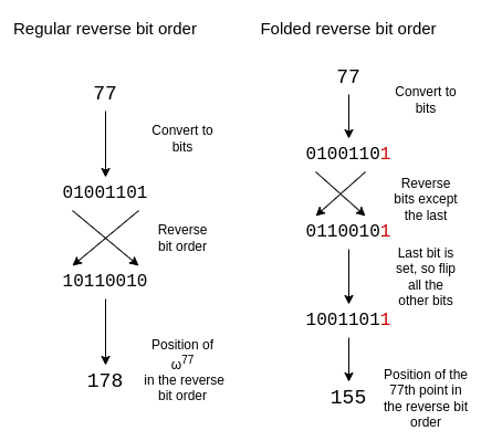 To adjust reverse bit order to reflect this folding structure, we reverse every bit except the last. We keep the last bit, and we also use it to determine whether or not to flip the other bits.