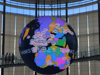 Left: Museum of the Future, Dubai, view from the outside. Right: giant orb inside the Miraikan, Tokyo, showing the world's major languages.